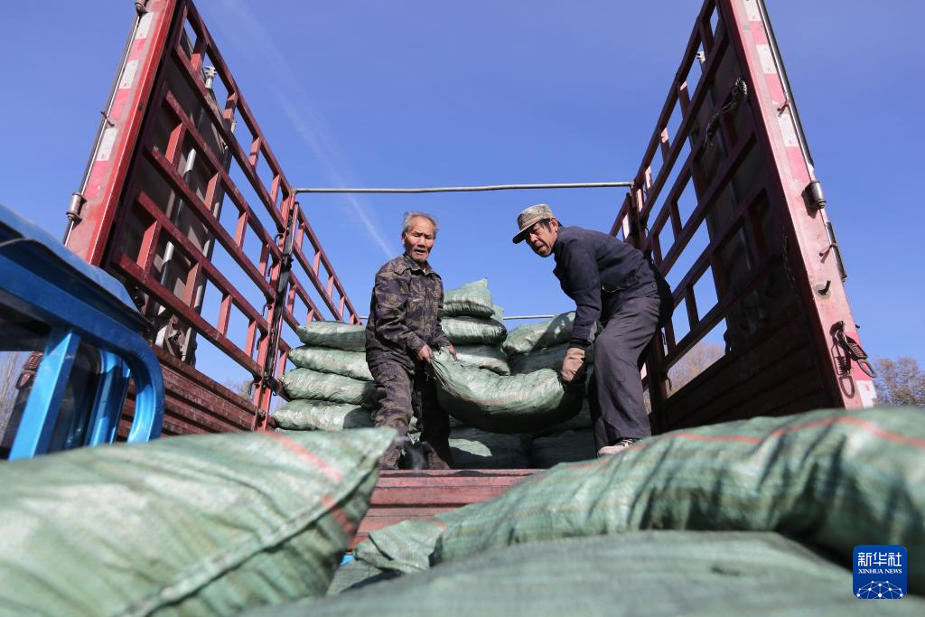 11月19日,甘肃省定西市安定区内官营镇先锋村村民在搬运政府发放的取暖用煤。新华社发(王克贤摄)