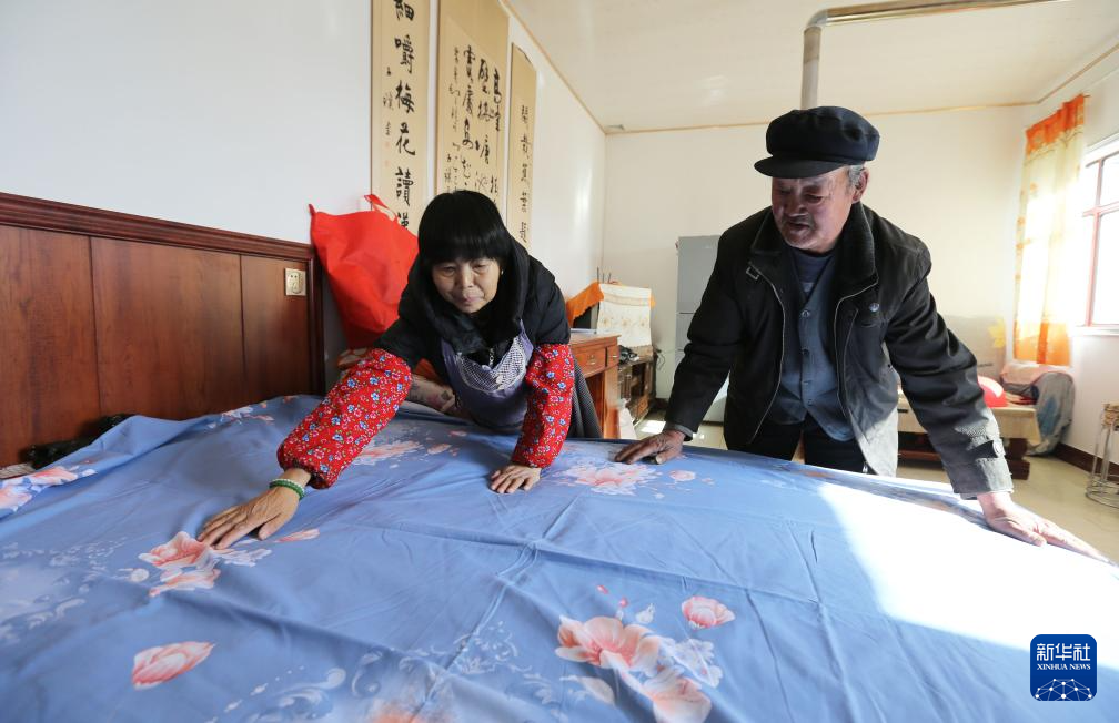 11月19日,甘肃省定西市安定区内官营镇先锋村村民在整理刚领到的新床单。新华社发(王克贤摄)
