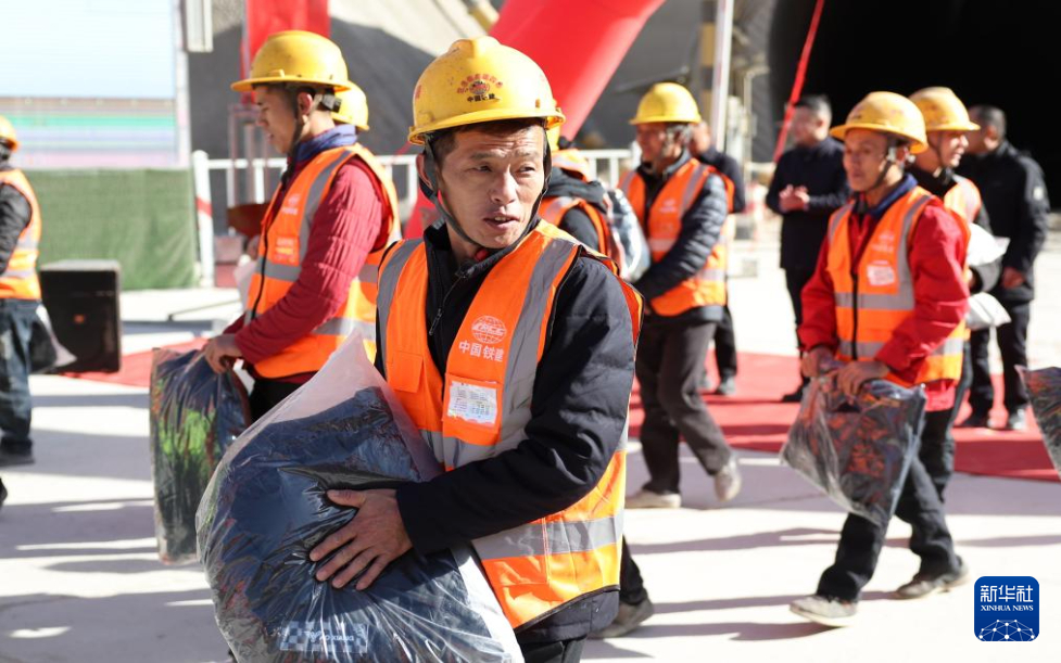 12月2日,参与隧道建设的中铁二十局建设者在施工一线领取到御寒保暖的棉服。新华社记者 陈斌 摄
