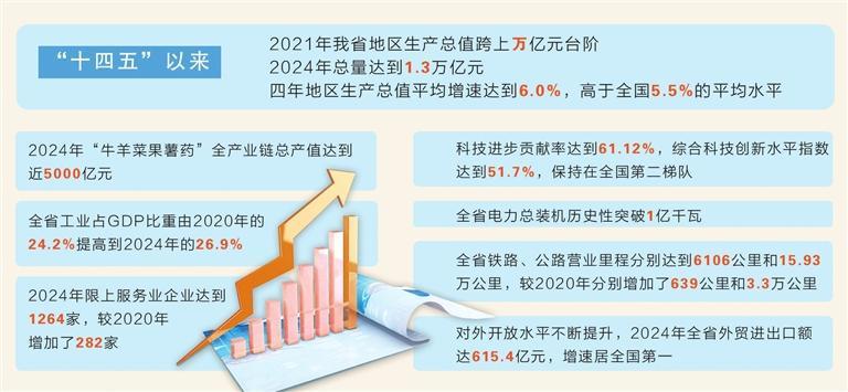 综合经济实力实现新跃升。2021年甘肃省地区生产总值跨上万亿元台阶,2024年总量达到1.3万亿元。四年地区生产总值平均增速达到6.0%,高于全国5.5%的平均水平。