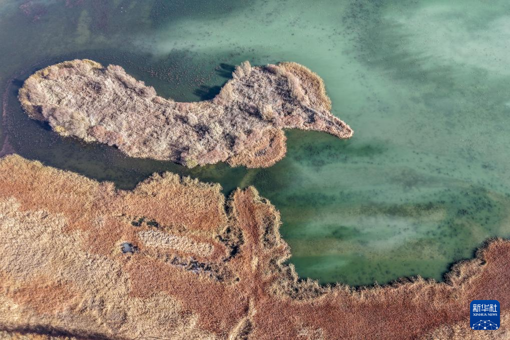 这是11月12日在河西走廊中部的张掖黑河湿地国家级自然保护区高台段拍摄的一处湖泊(无人机照片)。新华社记者 郎兵兵 摄