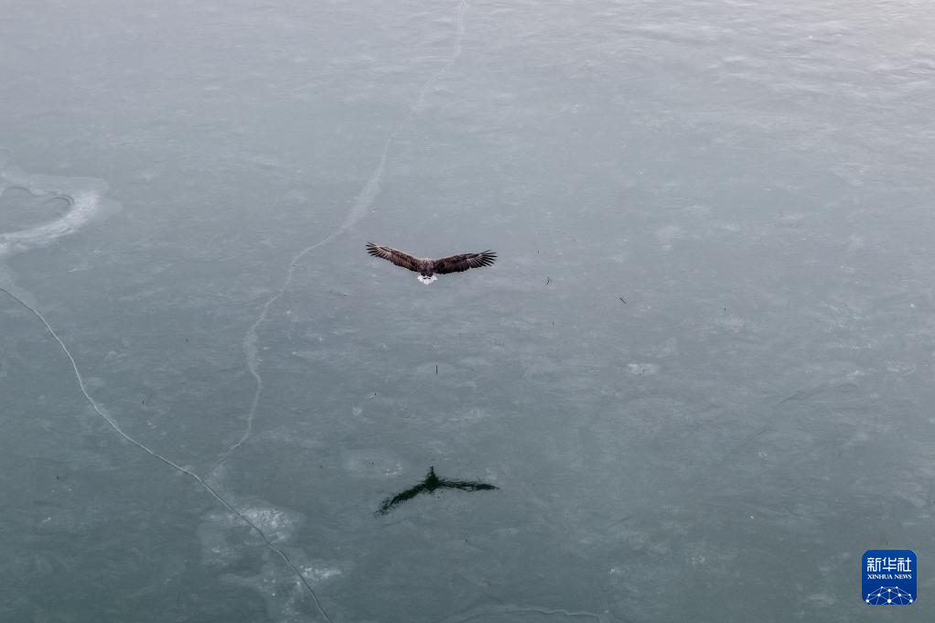 11月22日,在河西走廊东端的甘肃民勤石羊河国家湿地公园,国家一级保护野生动物白尾海雕在红崖山水库翱翔(无人机照片)。新华社记者 郎兵兵 摄