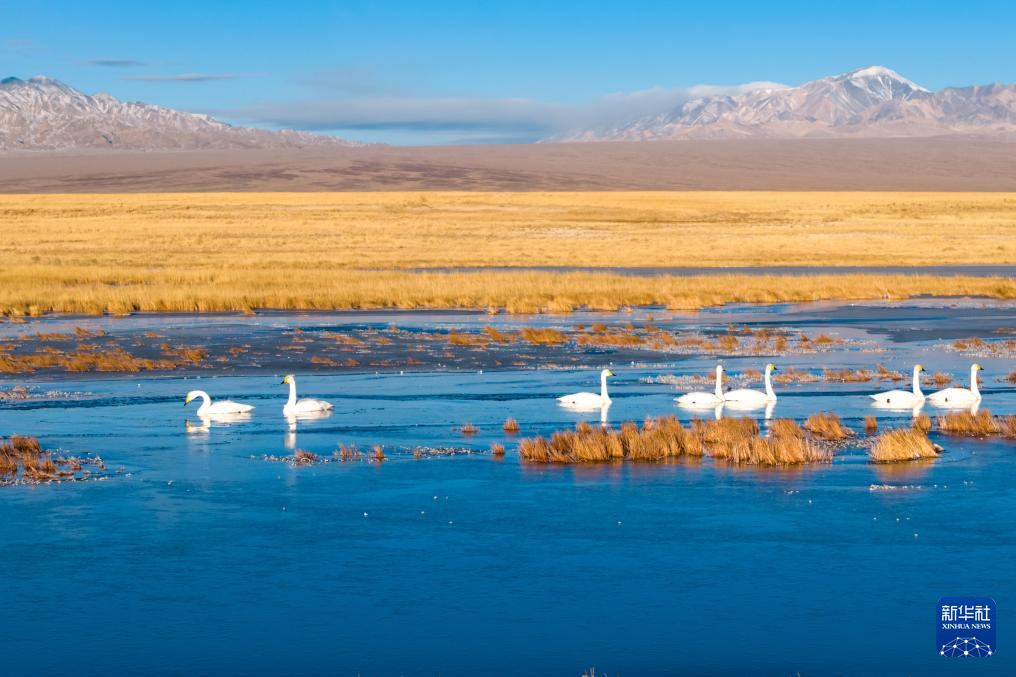 11月14日,在河西走廊西端的甘肃省阿克塞县小苏干湖湿地,大天鹅在一处水域游弋觅食(无人机照片)。新华社记者 郎兵兵 摄