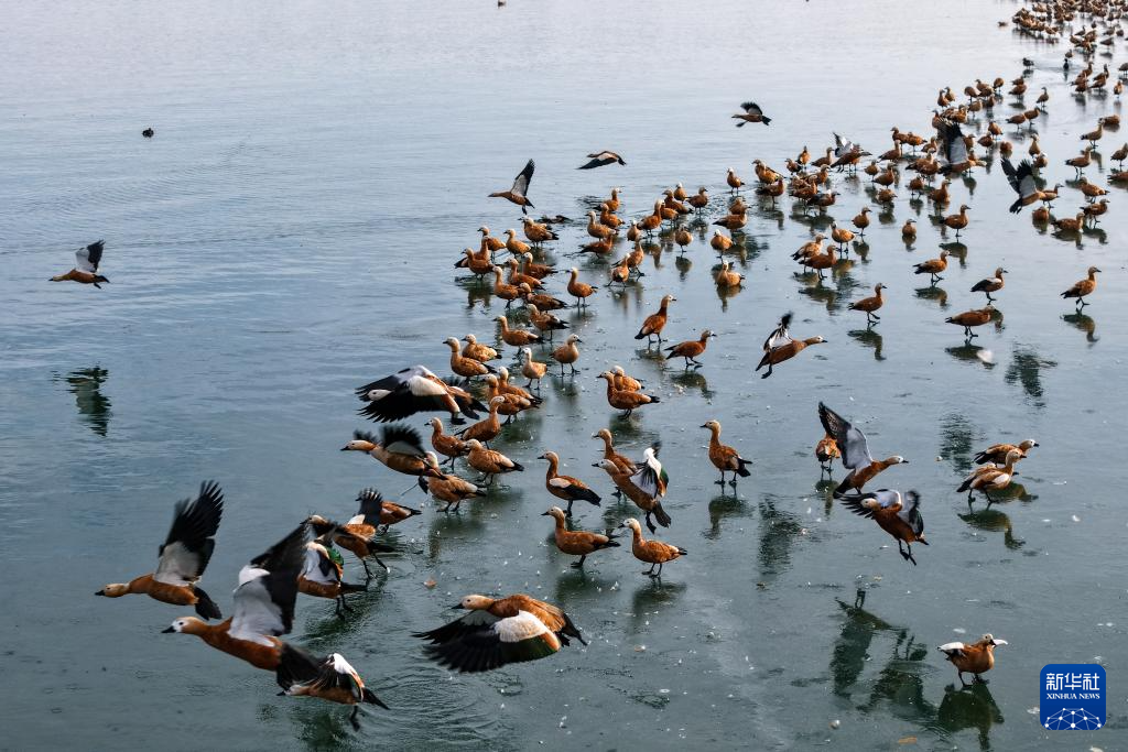 11月22日,在河西走廊东端的甘肃民勤石羊河国家湿地公园,一群赤麻鸭在红崖山水库嬉戏觅食。新华社记者 张智敏 摄