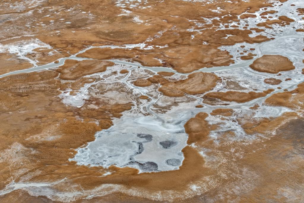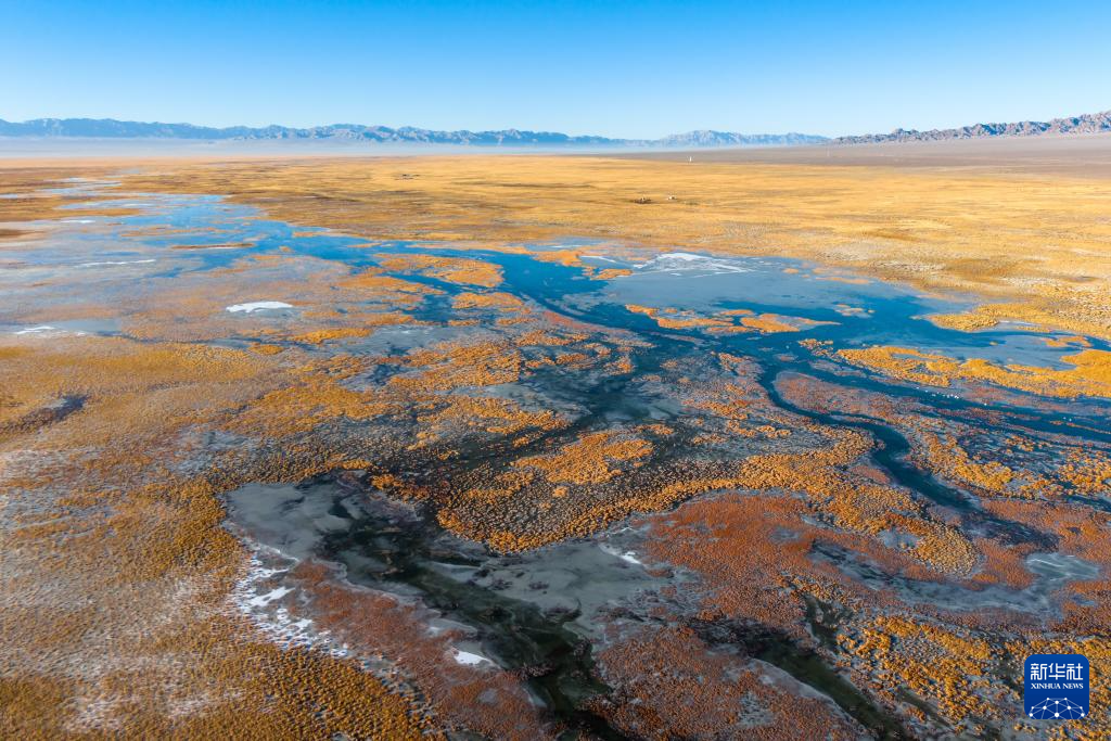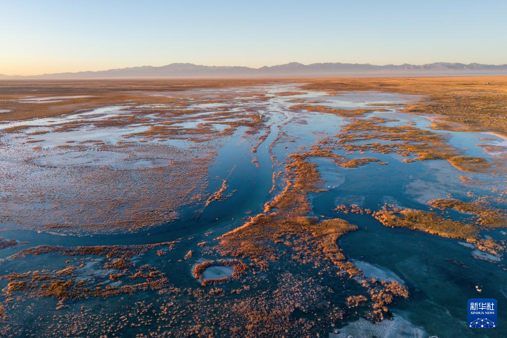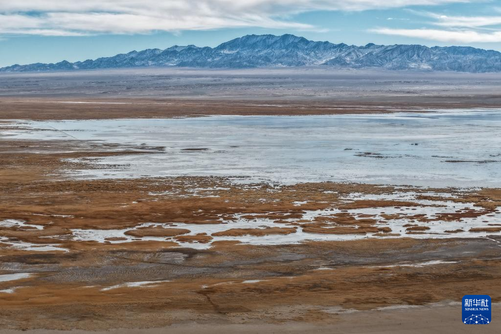 这是11月14日在甘肃省酒泉市阿克塞县阿伊纳乡拍摄的小苏干湖风光(无人机照片)。新华社记者 郎兵兵 摄
