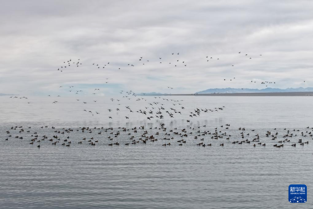11月16日,一群水鸟在甘肃省阿克塞县大苏干湖省级候鸟自然保护区活动觅食(无人机照片)。新华社记者 郎兵兵 摄