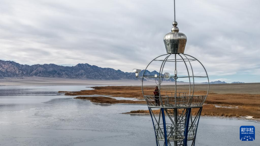 11月16日,护林员在甘肃省阿克塞县大苏干湖省级候鸟自然保护区的一处瞭望塔上观测湖面结冰情况(无人机照片)。新华社记者 郎兵兵 摄
