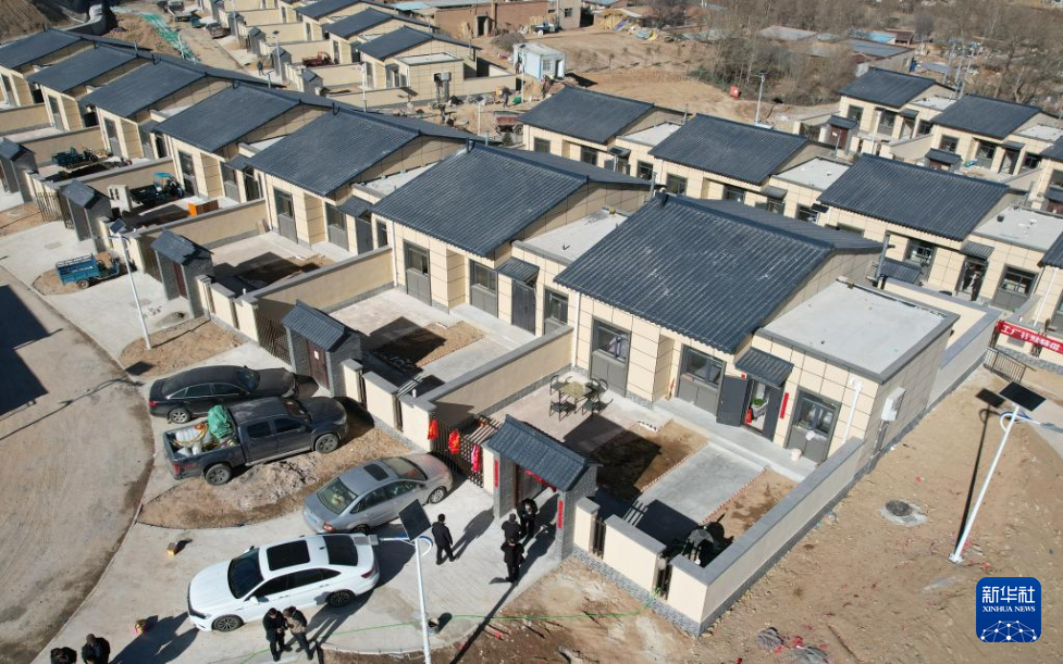 在榆中县马坡乡马莲滩村集中安置点,一户村民在庆祝乔迁(12月1日摄,无人机照片)。新华社记者 陈斌 摄