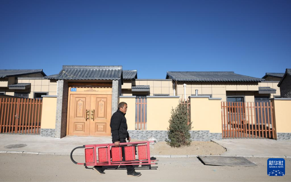 12月1日,在榆中县马坡乡旧庄沟村安置点,村民王利军提着梯子从新家门前的路上走过。新华社记者 陈斌 摄