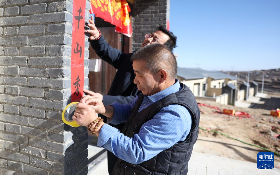 12月1日,在榆中县马坡乡马莲滩村集中安置点,村民张争琦(前)在给新家的大门贴对联。新华社记者 陈斌 摄