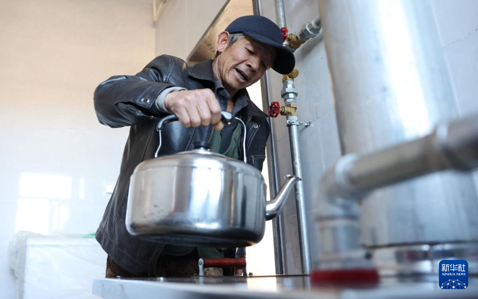 12月1日,在榆中县马坡乡旧庄沟村安置点,村民王建武在新家烧水。新华社记者 陈斌 摄